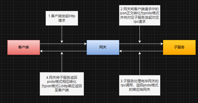 因为我们的所有客户端请求会发起http请求到网关,然后网关再通过rpc调用相应的子服务,大致演示流程如下: