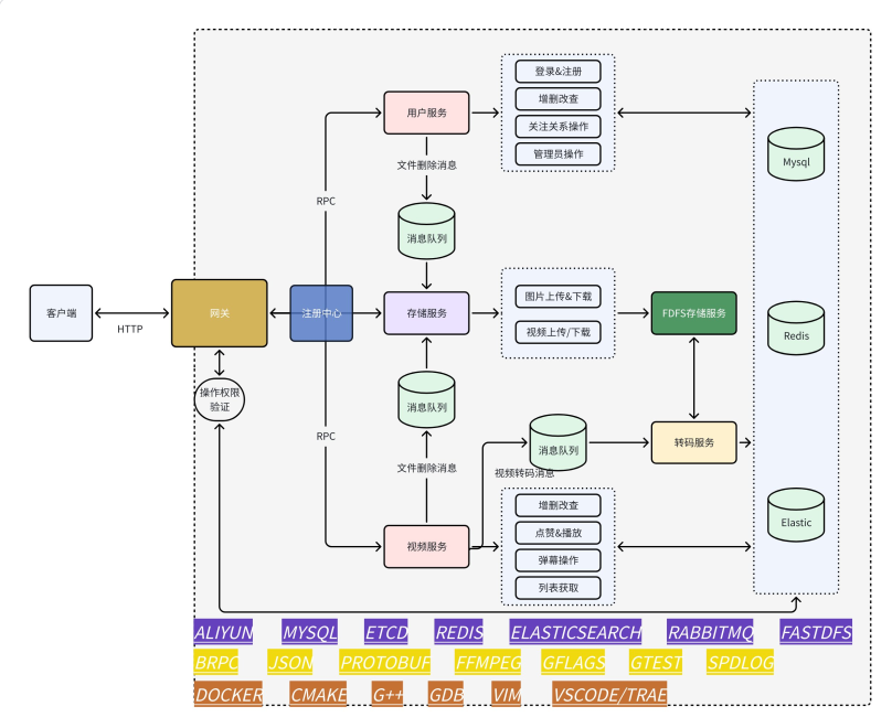 - 网关子服务:对客⼾端请求进⾏权限检测, 并作为客⼾端与业务⼦服务之间的通信中转。