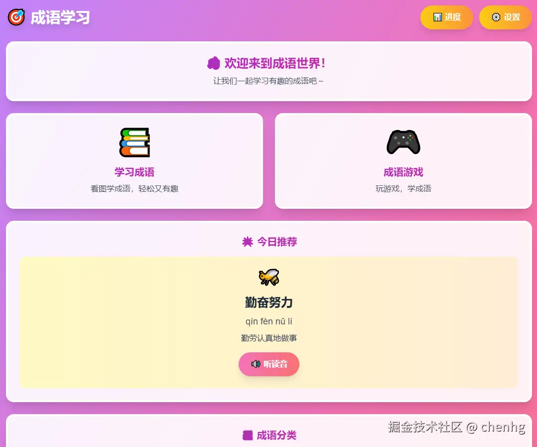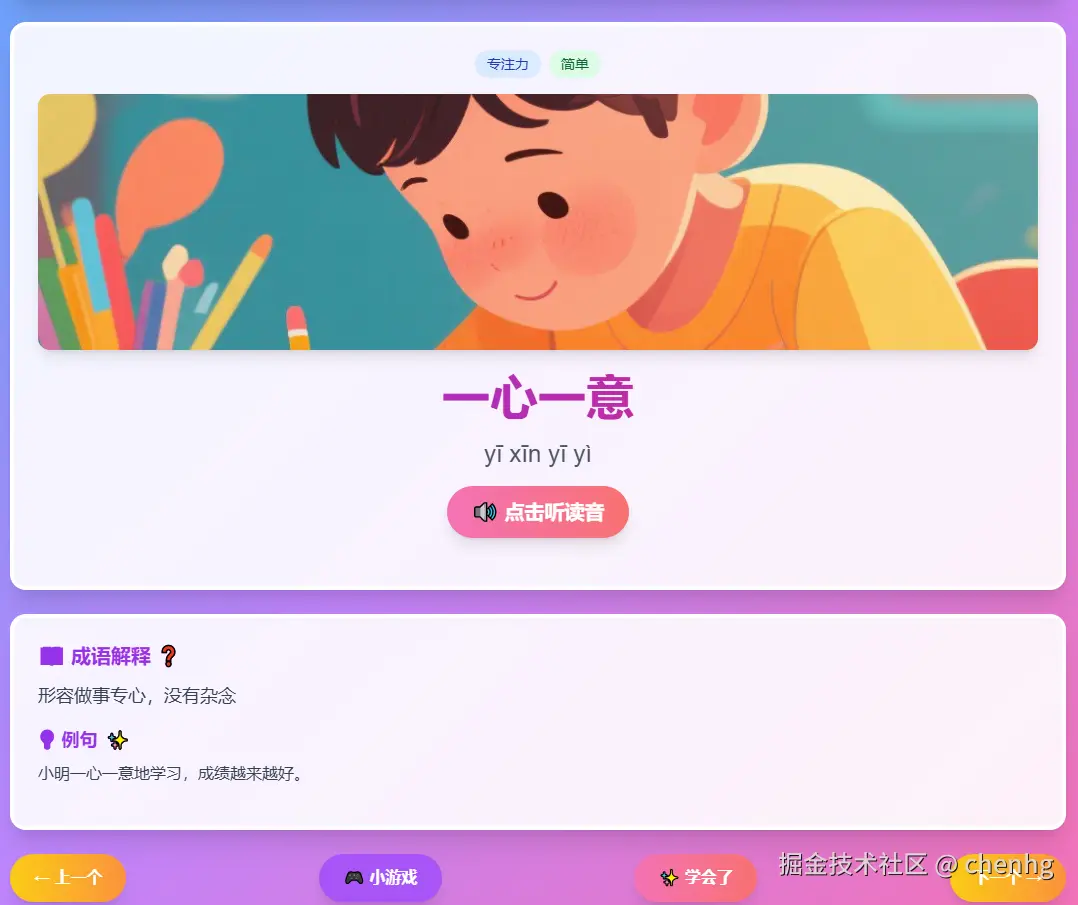 | 学习页面 | 成语展示 | 全屏展示模式,成语文字居中显示,拼音使用较小字号在下方 |