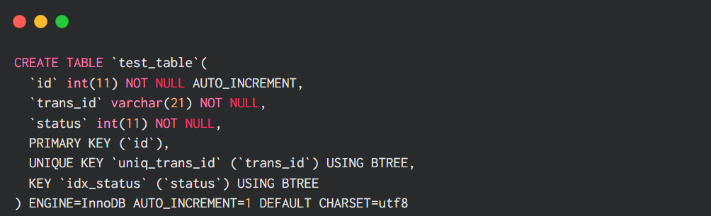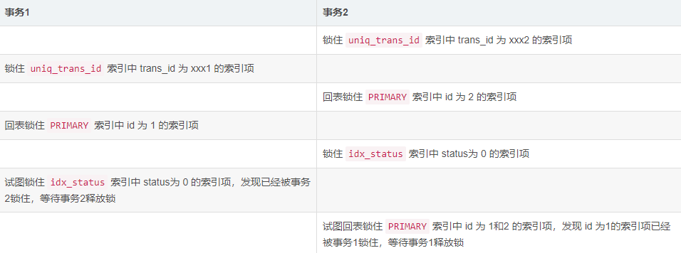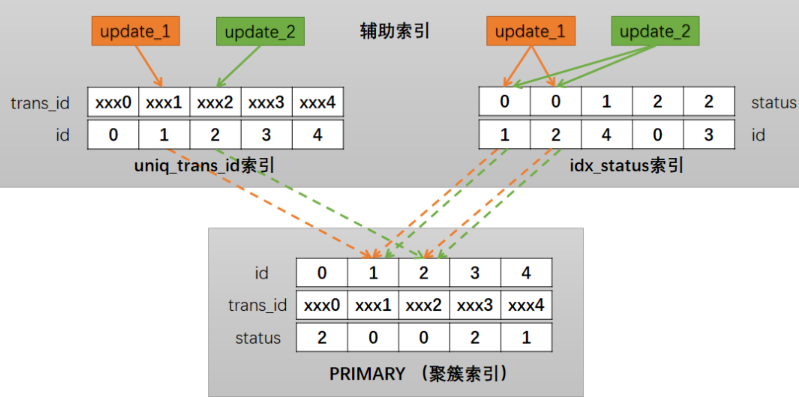 在不同事务对示例表 test_table 执行UPDATE test_table SET status = 1 WHERE trans_id = '38' AND status = 0 ;MySQL 会根据 trans_id = 38 这个条件,利用 uniq_trans_id 聚簇索引找到叶子节点中保存的 id 值;同时会根据 status = 0 这个条件,利用 idx_status 二级索引找到叶子节点中保存的 id 值;然后将找到的两组 id 值取交集,最终通过交集后的 id 回表。