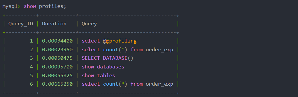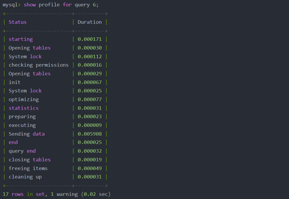 通过 show profile query #{id} 语句能够看到执行过程中线程的每个状态和消耗的时间