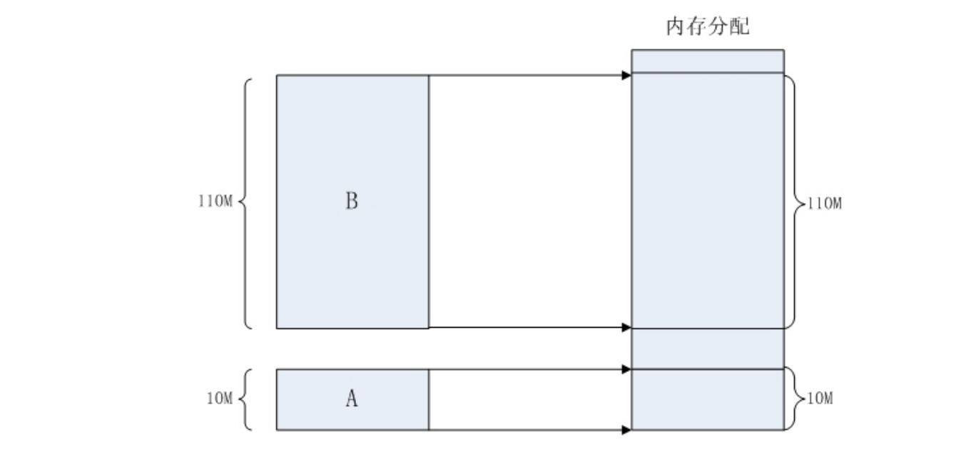 那当程序同时运行多个程序时,操作系统是如何为这些程序分配内存的呢?例如某台计算机总的内存大小是128M,现在同时运行两个程序A和B,A需占⽤内存10M,B需占用内存110。计算机在给程序分配内存时会采取这样的方法:先将内存中的前10M分配给程序A,接着再从内存中剩余的118M中划分出110M分配给程序B。