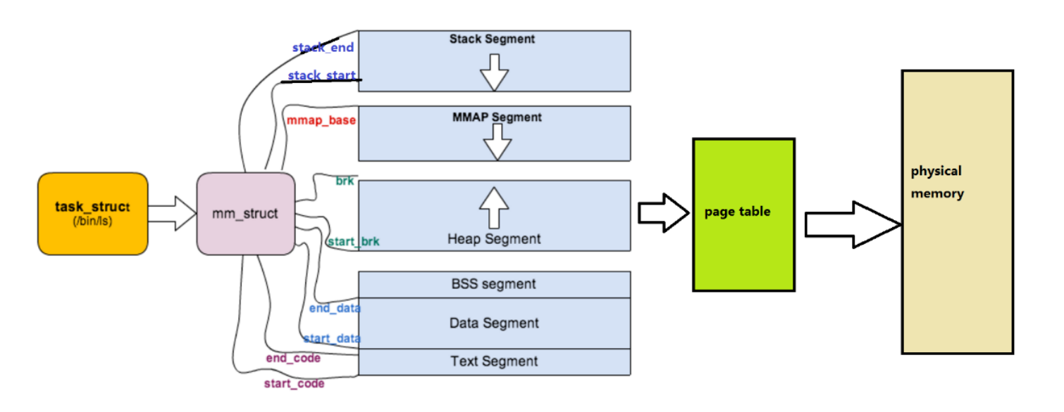 可以说, mm_struct 结构是对整个用户空间的描述。每一个进程都会有自己独立的 mm_struct ,这样每一个进程都会有自己独立的地址空间才能互不干扰。先来看看由 task_struct 到 mm_struct ,进程的地址空间的分布情况: