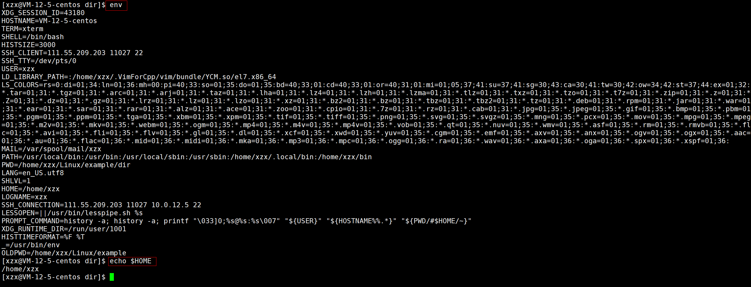 还存在一个环境变量HOME;当我们执行cd ~时,命令行解释器bash就会在环境变量表中查找HOME,然后进入到HOME家目录(工作目录)中。