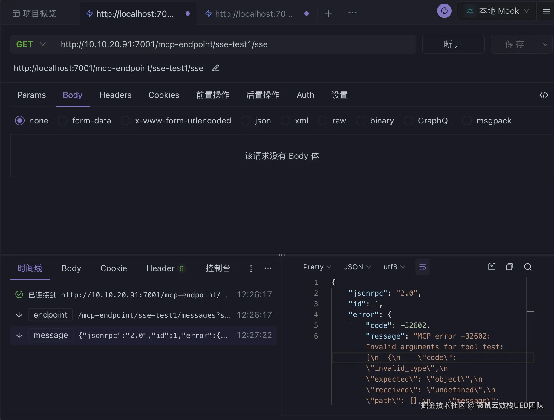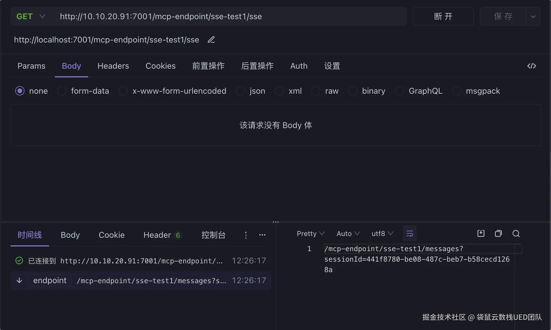 SSEServerTransport的endpoint仅仅用来指引客户端消息体往哪个API接口发送, 所以我们在哆啦A梦后端创建的endpoint与真实MCP服务器返回的endpoint是没有关系与冲突的。