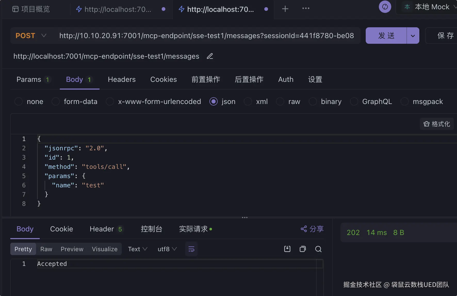 /messages端点发起实际请求,如 initialize, tools/list,注意此时服务端不会把数据结果支持返回到/messages,而是直接返回202 Accept