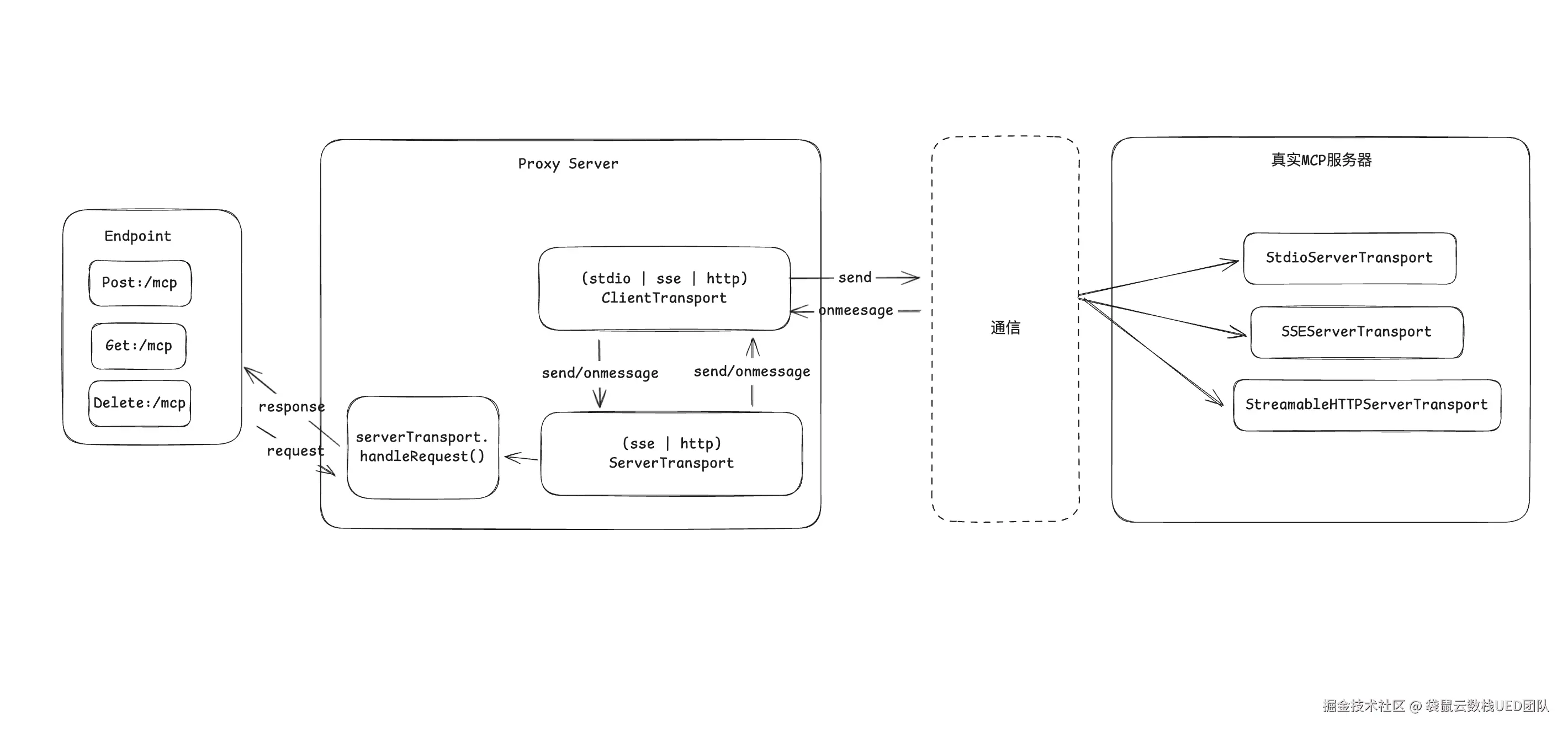 因此,我们还需要在哆啦A梦层创建一个SSEClientTransport, 将我们从真实客户端发送的消息通过SSEClientTransport再发送给真实MCP服务器。