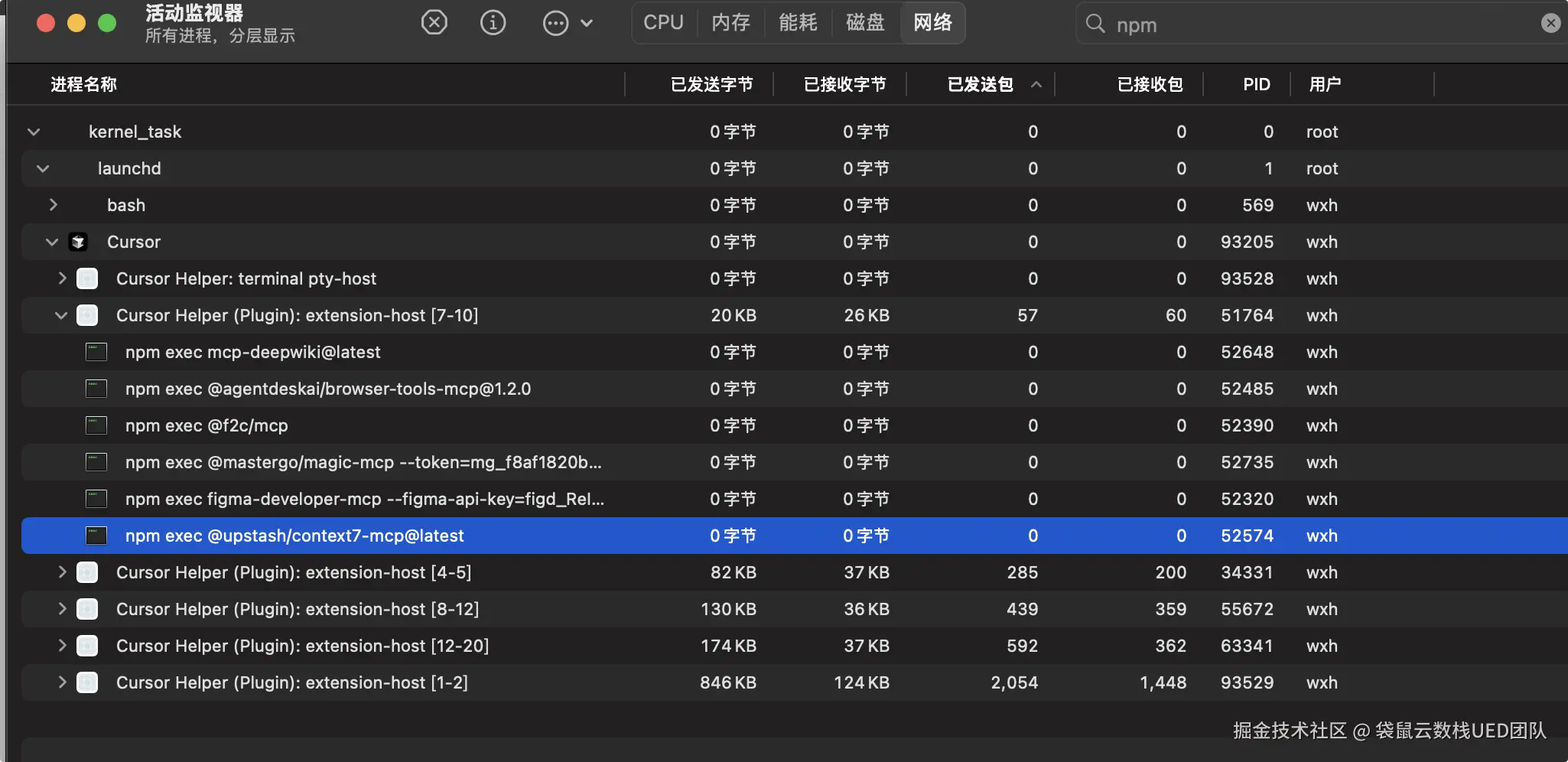 我们在任务管理器中可以看到所有配置的MCP都被以子进程的形式启动了