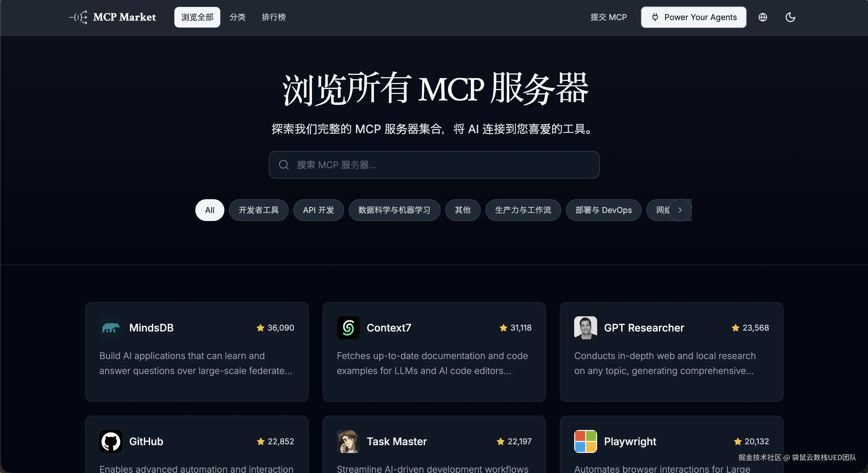 MCP市场 - 用于查询已注册的MCP服务列表,同大多数MCP Market一样,包含使用说明,配置,工具列表等信息