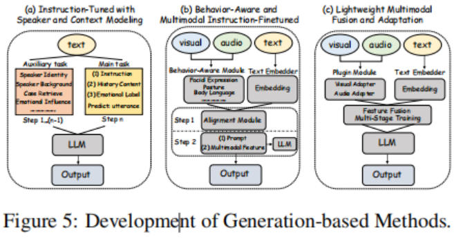 **利用多模态语言模型(LLMs)的高效微调方法。**多模态LLMs在使机器跨模态学习方面取得了重大进展。一些模型越来越多地应用于多模态情感识别(MERC),能够实现不同模态下的零样本或少量样本泛化。在MERC中使用LLMs为捕捉更深层次的语义和对话线索开辟了新的可能性,而不仅仅是表面的情感信号。然而,对于情感理解的高效微调这些模型仍然面临挑战,尤其是在资源有限和文化多样化的环境中。如何高效地适应多模态语言模型(MMLMs),以捕捉不同数据集、语言或跨文化背景下情感的细微差别,仍然是一个开放的研究领域。