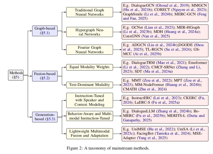 本节探讨了MERC任务的最新方法。论文从三个角度进行了总结:基于图的方法、基于融合的方法以及基于生成的方法。图2展示了这些方法及其子类别的概述,并附有代表性示例。