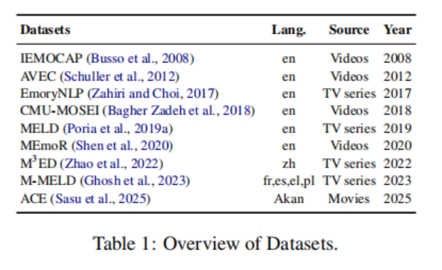 MERC旨在通过整合语言、声学、视觉信号等多种模态,来理解情感。尽管最近的研究引入了多种建模策略,但在数据稀缺、模态对齐以及跨语言和文化的泛化方面仍面临重大挑战。