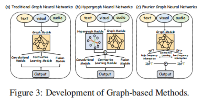 对话可以自然地被解释为图结构,因为话语之间存在内在的相关性和依赖性。对话通常涉及多轮互动,具有复杂的依赖和交互模式,这些可以通过图神经网络(GNNs)的边结构进行有效建模(Scarselli等,2009)。随着对多模态对话理解的兴趣日益增加,GNNs的应用已从文本数据扩展到多模态输入(Liu等,2024a)。此外,最近的方法还集成了辅助模块(如卷积、对比学习和融合),以提升性能。图3展示了基于图的方法的最新进展。论文将它们分为传统图、超图和傅里叶图神经网络。