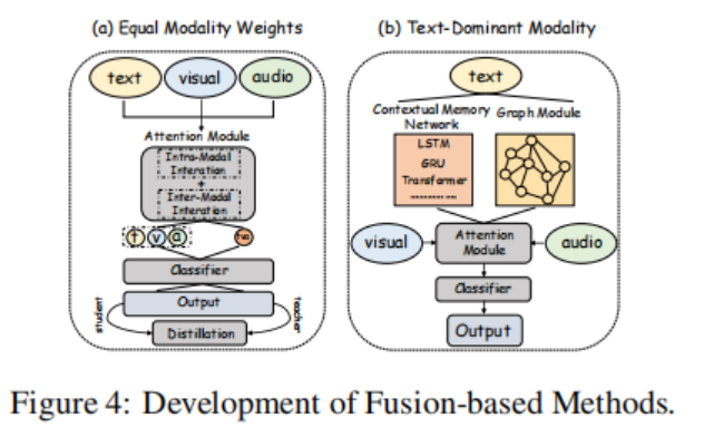 在MERC中,异构多模态特征的有效融合至关重要,但这一过程因交互建模时引入的噪声而变得极具挑战性。Transformer架构通过其自注意力机制,促进了MERC方法在捕捉跨模态和上下文依赖方面的进步。为了增强跨模态的互动,最近的方法在Transformer的基础上采用了定制的融合策略。论文将这些方法称为基于融合的方法,并在图4中进行了说明。一些方法通过促进模态间的平等互动来提高鲁棒性,而其他方法则采用主辅模式,通常以文本为核心,其他模态提供补充信号。
