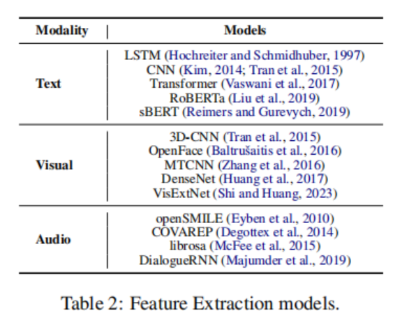 **特征提取。**为了实现有效的多模态分析,必须首先从每个模态流(文本、音频、视觉)中提取特征。主流方法通常在这一初始阶段分别处理这些模态。尽管核心提取技术往往有重叠,但在多模态设置中,关键区别在于这些特征的使用目的和后续应用。在单模态情感识别中,提取器的目标是在单一模态内捕捉足够信息以进行情感分类。表2概述了本文调查的多模态研究中常用的特征提取模型。