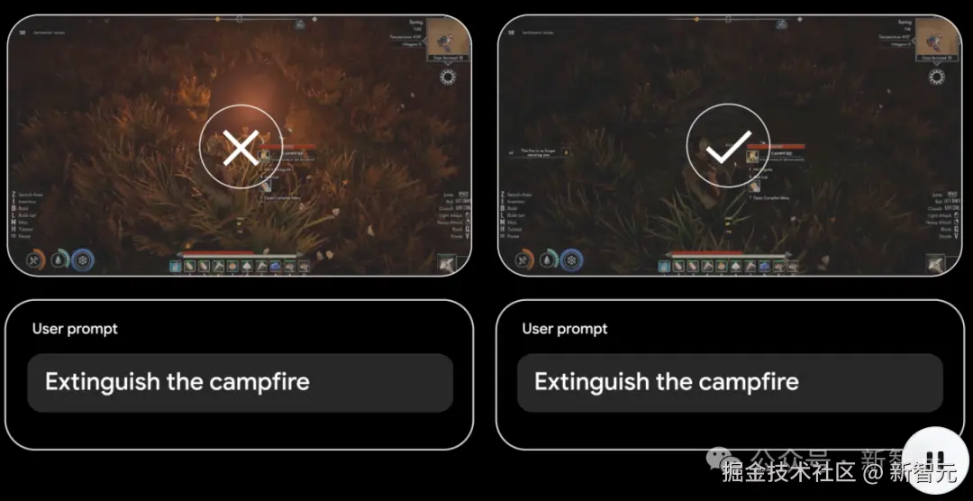 左侧展示的是初代 SIMA 2 智能体未能完成的任务示例。