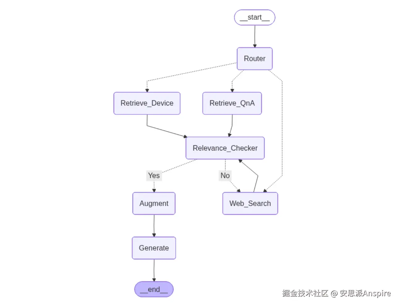 查询 → 路由器(源选择) → 检索 → 相关性检查器 → 如果相关:生成,如果不相关:转到网络搜索 → 结束