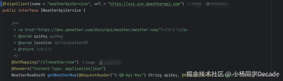 需要调用第三方和风天气的api,获取天气信息 编写了如下使用openfeign调用的接口