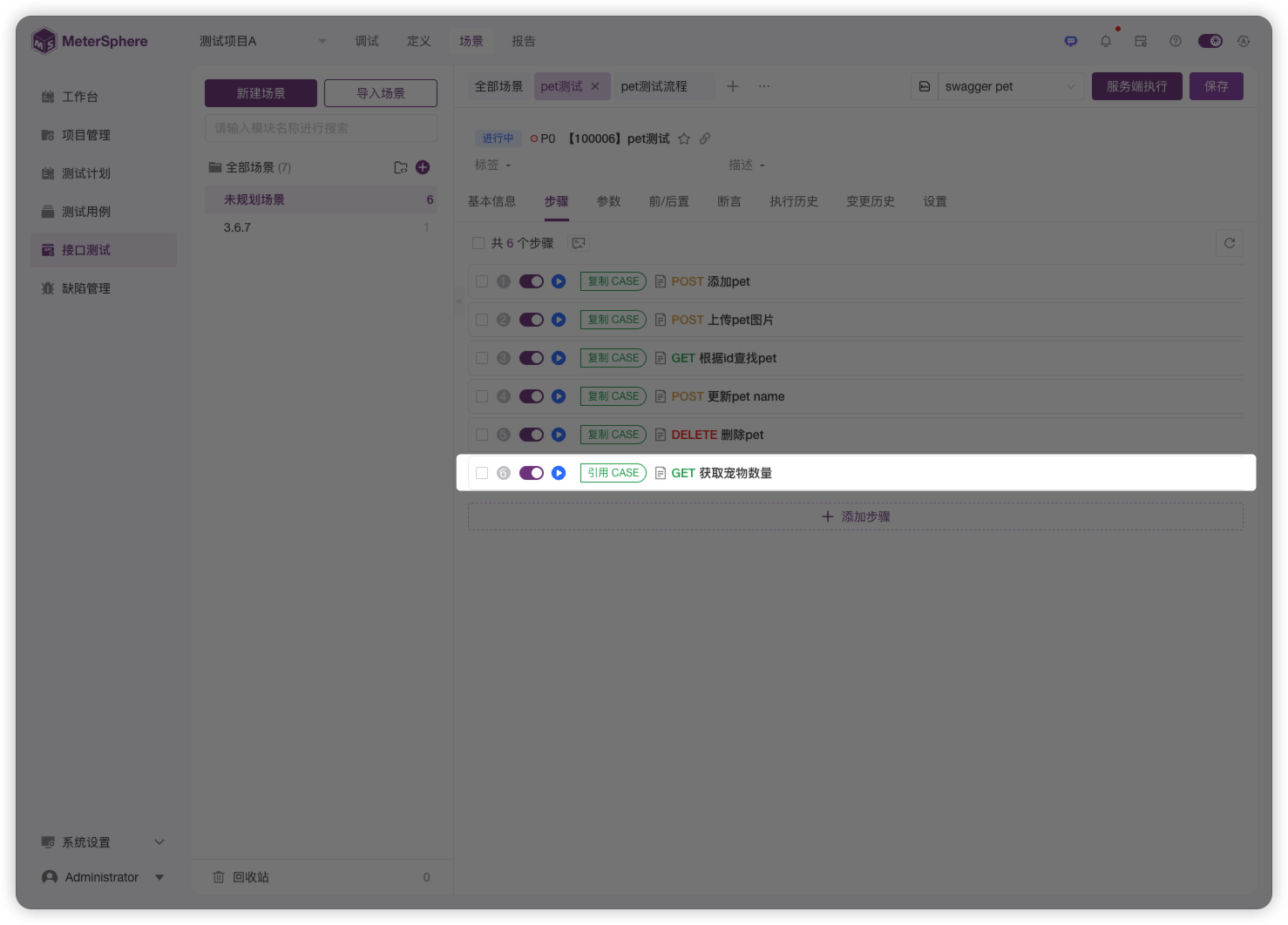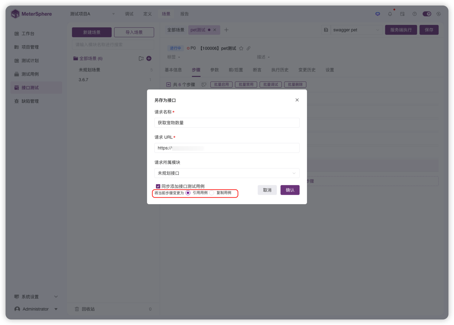 在MeterSphere v3.6.7 LTS版本中,在对接口场景中的自定义请求步骤进行"另存为新接口"的操作时,用户可以一键将当前步骤变更为"引用用例"或"复制用例"步骤。这一功能可以助力测试团队提高接口场景的编写效率,并且可以降低测试用例的维护成本。
