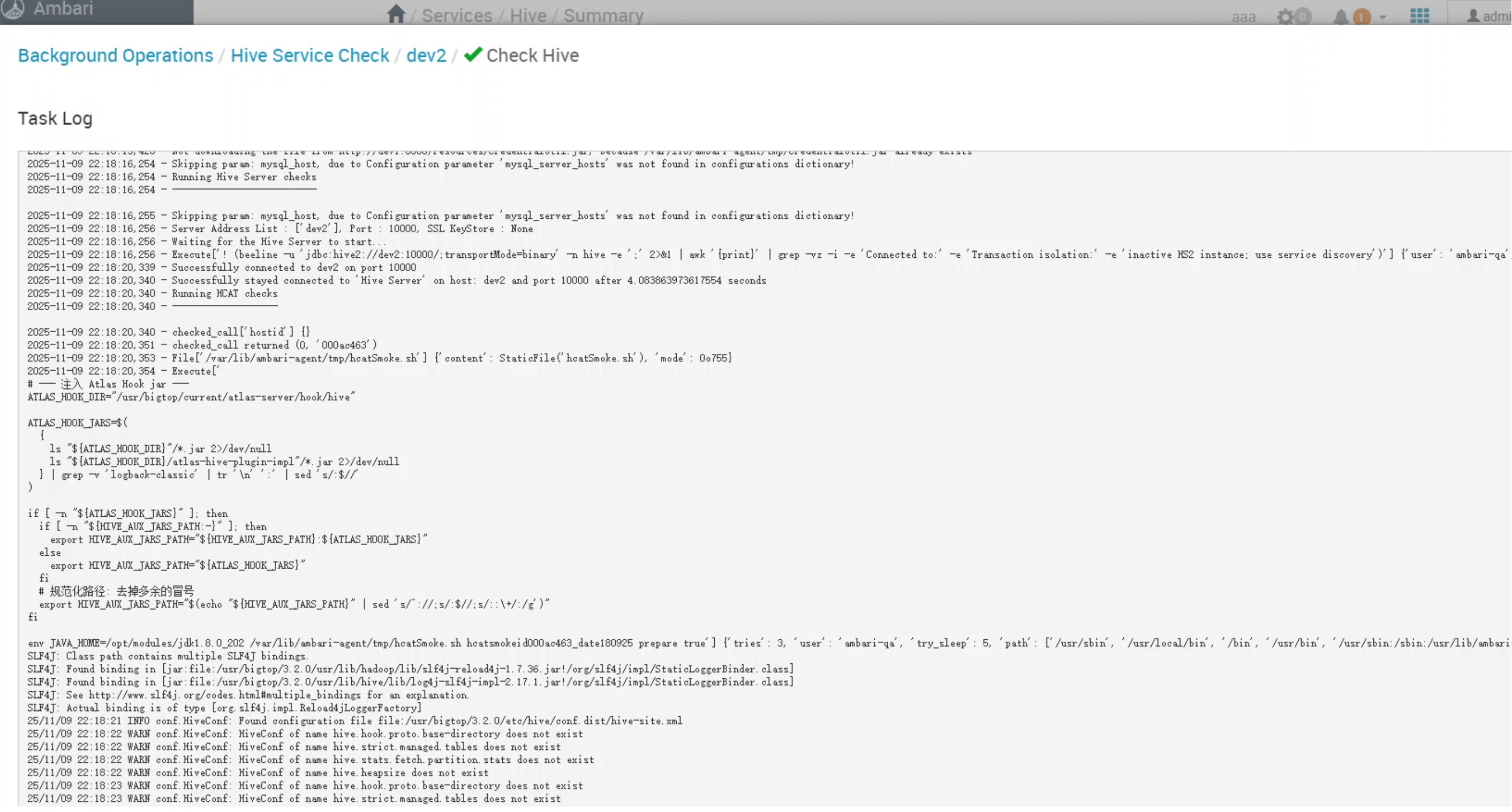 执行日志应出现我们注入的 Atlas Hook 相关 echo/环境变量,且不再报: