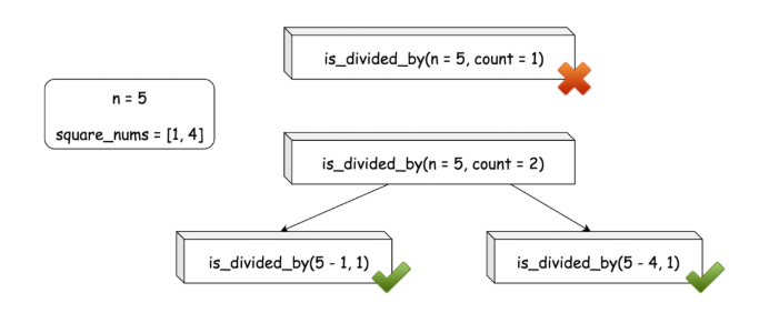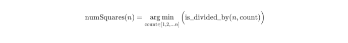 为了更好的解释,我们首先定义一个名为 is_divided_by(n, count) 的函数,该函数返回一个布尔值,表示数字 n是否可以被一个数字 count 组合,而不是像前面函数 numSquares(n) 返回组合的确切大小。