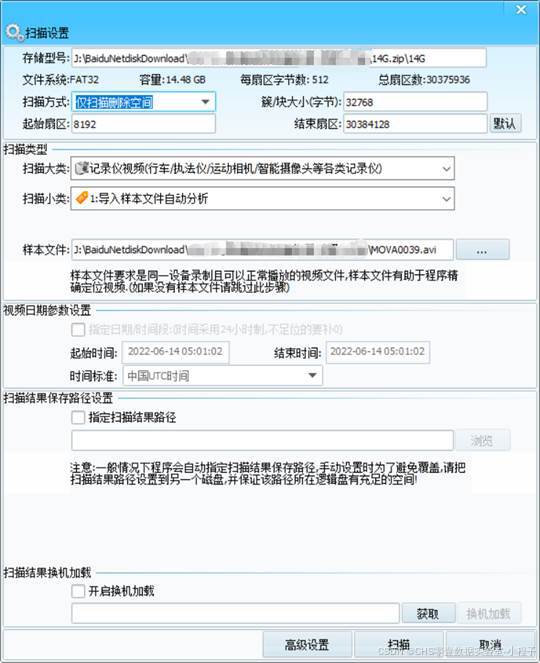 当出现误操作后正确的操作方法是"断开存储设备和车机的物理连接"。而从图1可以看到这个优盘还有大约4.4GB的未使用空间,相对来讲剩余空间越大恢复的可能性就越高,不过此案例中客户的要求并非恢复指定某时间段的视频,而是全部恢复,所以直接扫描即可。