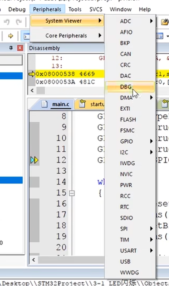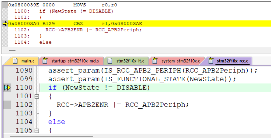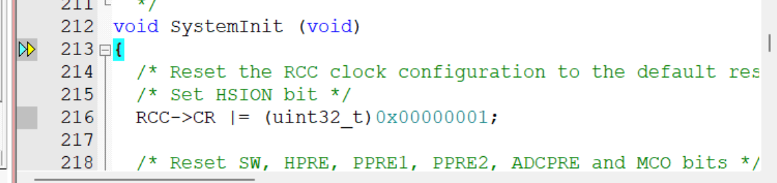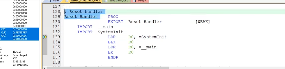 这里我们可以看到,现在程序是在启动文件的复位中断函数里,说明复位后,程序是从这里开始执行的
