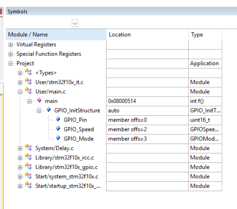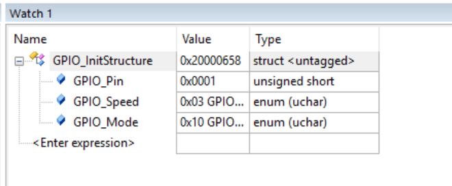 - 比如我们想看这个GPIO_InitStructure结构体的值,那就可以在这个窗口找一下。里面可以看到结构体的三个成员