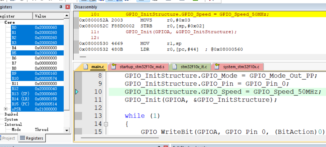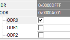 接下来我们运行,可以看到这个ODR0竟然是实时显示输出寄存器 的变化的,这说明在线调试是允许的
