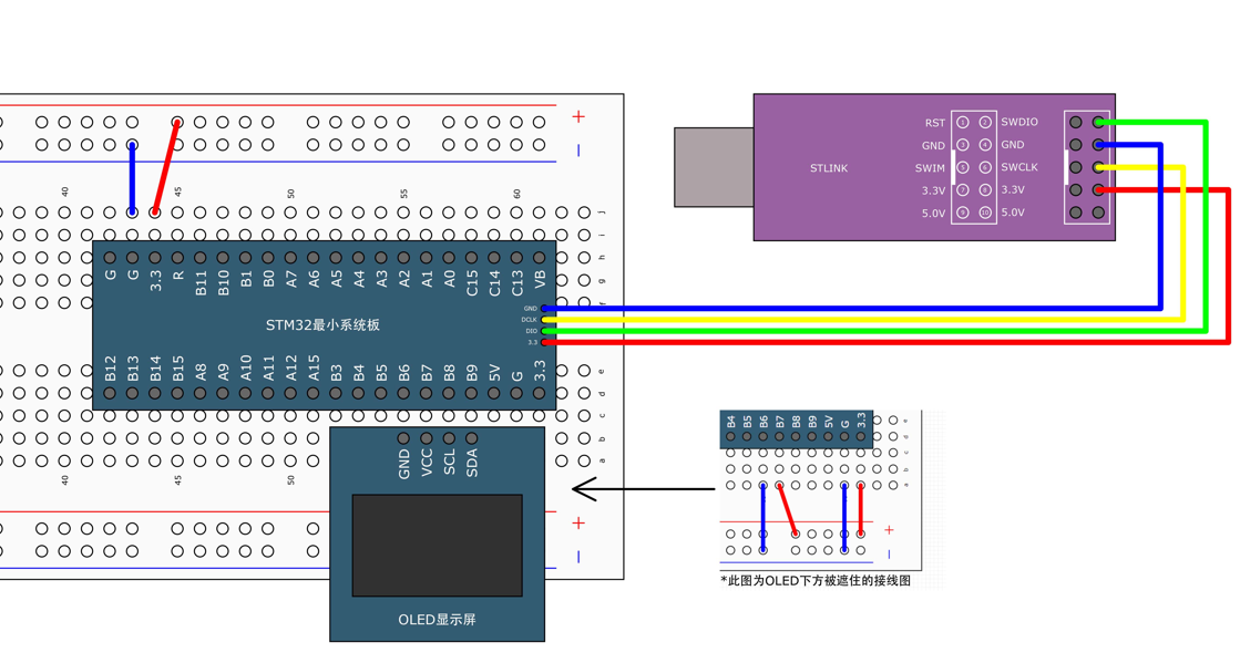 我们不要接这两个跳线,直接给PB6口输出低电平、PB7口输出高电平,用GPIO口直接给OLED供电是ok的,只是不够规范。实际项目最好用电源供电