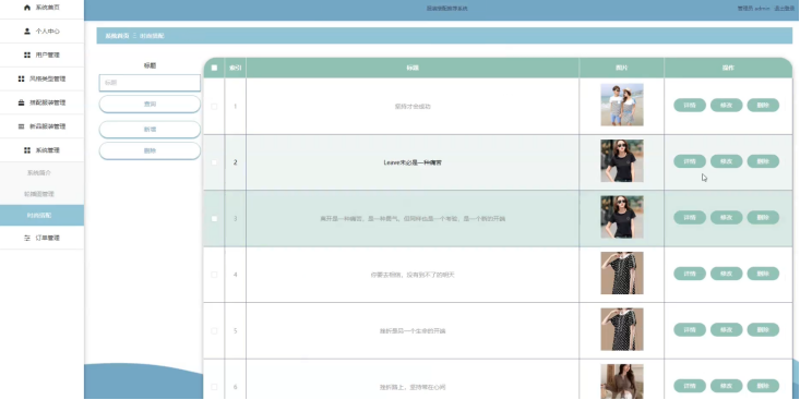 管理员点击系统管理。在时装搭配页面输入标题进行查询、新增或删除时装搭配列表,并根据需要对时装搭配信息进行详情、修改或删除操作;还可以对系统简介和轮播图管理进行详细操作;如图5-12所示: