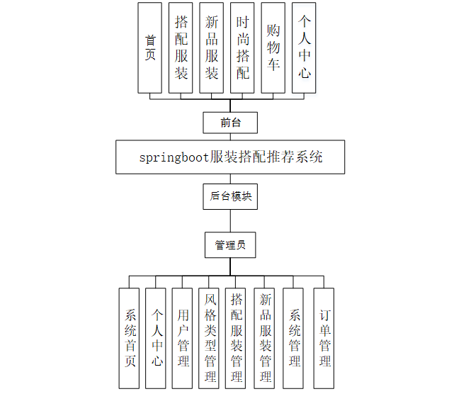 系统的建设可以为服装搭配推荐网站管理提供帮助,通过对一些基础信息管理实现针对性的安排,可以按照用户的角色权限使不同用户角色看到不一样的信息界面。现根据需求阶段的分析,我们可以大致确定系统需要包含的功能如下图所示:
