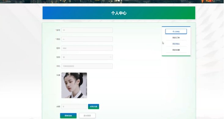 个人中心:在个人中心通过填写个人详细信息进行更新信息操作,还可以对我的订单、我的地址和我的收藏进行详细操作;如图5-5所示: