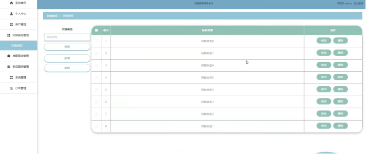 管理员点击风格类型管理。在风格类型页面输入风格类型进行查询、新增或删除风格类型列表,并根据需要对风格类型详情信息进行修改或删除操作;如图5-9所示: