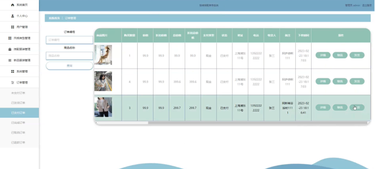 管理员点击订单管理。在已支付订单页面输入订单编号和商品名称进行查询或删除已支付订单列表,并根据需要对已支付订单详细信息进行详情、物流或发货操作,还可以对已完成订单、已退款订单、已发货订单、已取消订单、未支付订单进行详细操作。如图5-13所示: