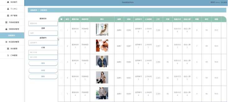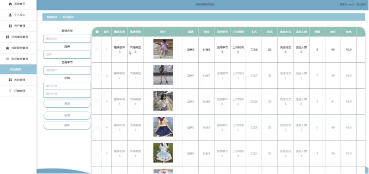 管理员点击新品服装管理。在新品服装页面输入服装名称、品牌、适合季节和价格范围进行查询、新增或删除新品服装列表,并根据需要对搭配服装详情信息进行修改或删除操作;如图5-11所示: