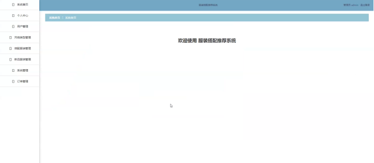 管理员进入主页面,主要功能包括对系统首页、个人中心、用户管理、风格类型管理、搭配服装管理、新品服装管理、系统管理、订单管理等进行操作。管理员主页面如图5-7所示: