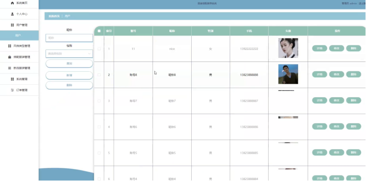 管理员点击用户管理。在用户页面输入昵称和性别进行查询、新增或删除用户列表,并根据需要对用户详情信息进行详情、修改或删除操作;如图5-8所示: