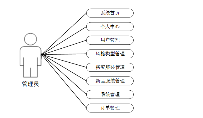 (2)管理员可以对系统首页、个人中心、用户管理、风格类型管理、搭配服装管理、新品服装管理、系统管理、订单管理等进行基本的信息管理。其用例分析如图3-2所示。