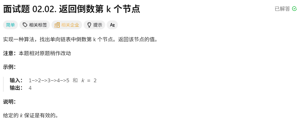 面试题 02.02. 返回倒数第 k 个节点 - 力扣(LeetCode)
