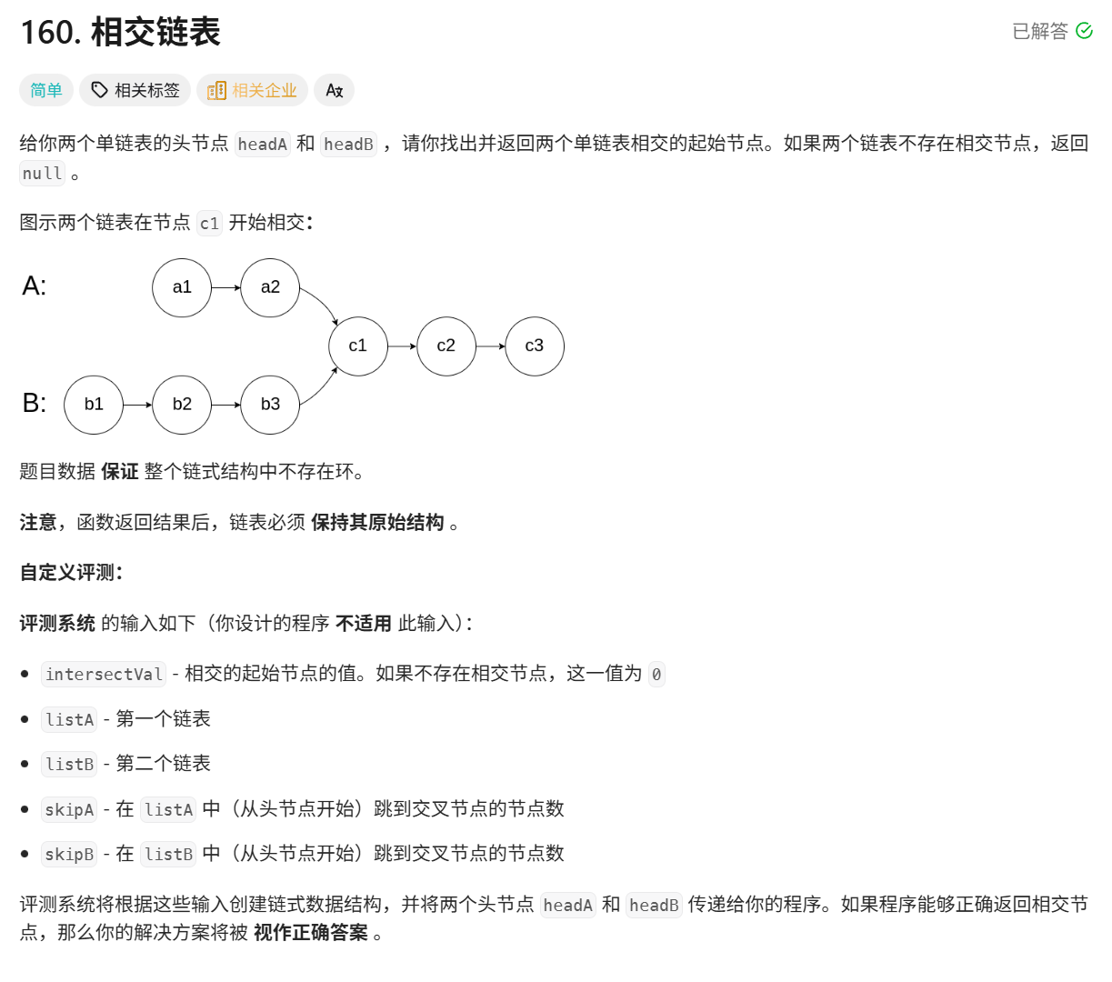 三、链表算法OJ题3:相交链表