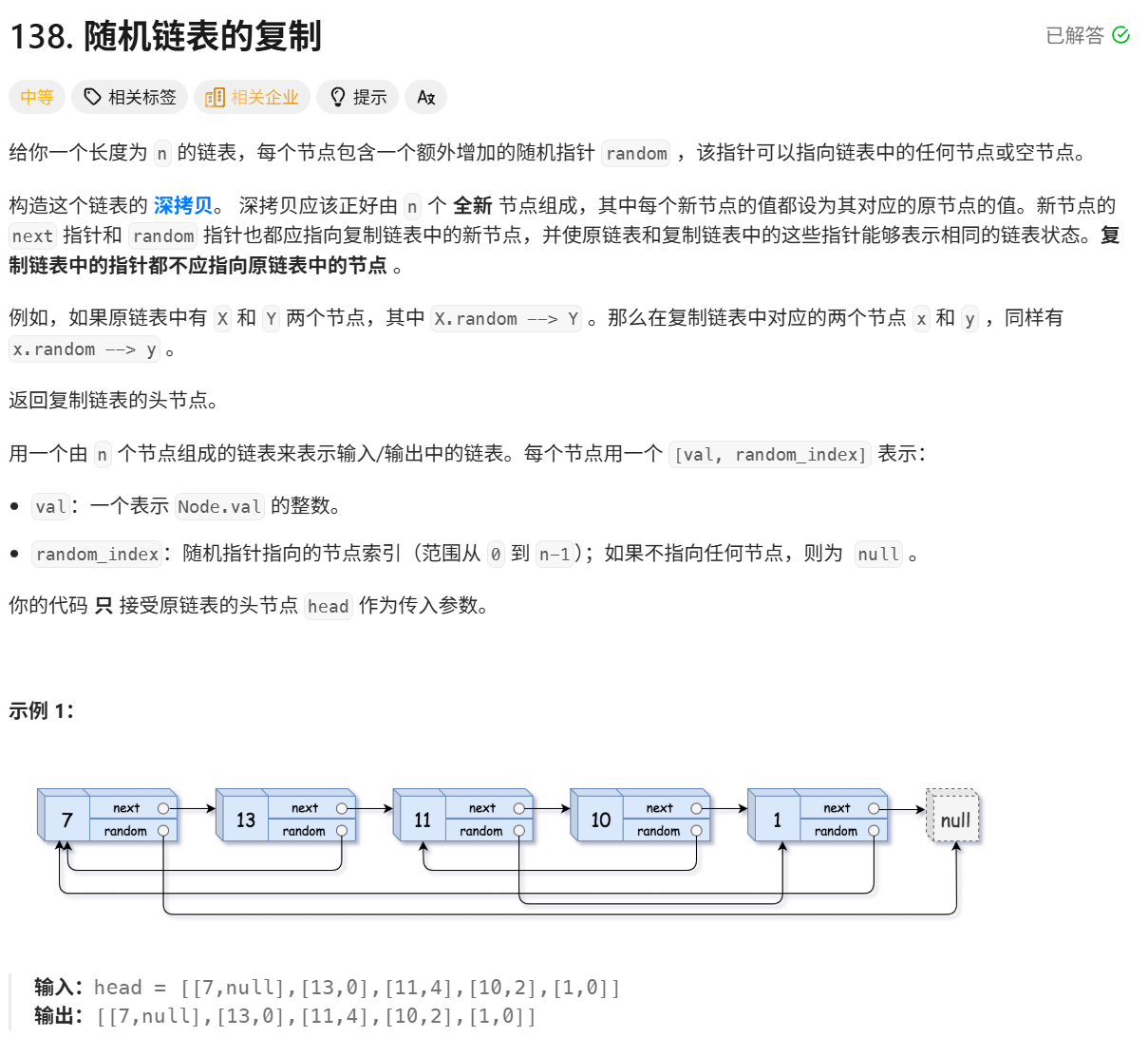 这道题需要采用三步插拆法实现带随机指针链表的深拷贝,核心利用将拷贝节点插入原节点后方的方式,避免额外空间存储节点映射关系,在O(n)时间复杂度和O(1)空间复杂度下完成拷贝。具体思路为首先遍历原链表,为每个原节点创建值相同的拷贝节点,并将拷贝节点插入到对应原节点的下一个位置,形成原节点与拷贝节点交替的链表结构;接着再次遍历原链表,根据原节点的random指针设置拷贝节点的random指针------若原节点random为空,拷贝节点random也为空,否则拷贝节点random指向原节点random所指节点的下一个拷贝节点;最后遍历链表,将插入的拷贝节点从原链表中拆分出来,通过copyhead和copytail构建独立的拷贝链表,同时恢复原链表的next指针结构,最终返回拷贝链表的头节点copyhead。我给出我的代码: