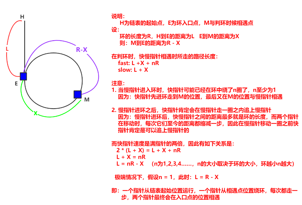 我们首先假设链表存在环,若不存在环,快指针会率先走到链表末尾NULL,直接返回无环,不在本次证明范围内,慢指针每次向后移动1步;每次向后移动2步;设链表的非环部分长度为L(,环的长度为C;所有分析基于指针进入环后,在环内做循环移动的特性。当慢指针进入环时,快指针已在环内某位置,当慢指针走了L步时,会到达环的入口节点。此时快指针的移动步数是慢指针的 2倍,即走了2L步;快指针先走完非环部分的 L 步,进入环;剩余的2L - L = L步在环内移动,因此快指针在环内的位置为pos = L % C,即快指针在环内距离入口节点的偏移量为pos,%为取余运算。此时,快慢指针都处于环内,慢指针在环入口,快指针在环内偏移pos的位置,两者的环内相对距离为d,若pos = 0则快指针也在环入口,此时快慢指针直接相遇;若pos > 0则环形结构中,相对距离取最短路径,即d = C - pos,快指针在慢指针后方d步的位置,因为环是封闭的。