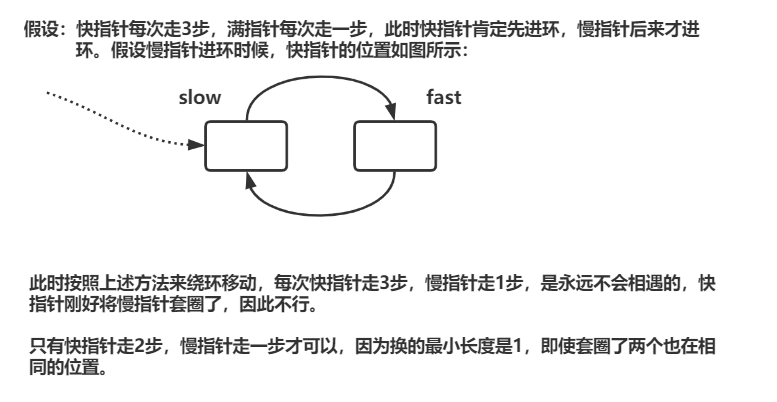 我们在上面的图片中简单讨论了一下情况,接下来我们尝试严密地证明一下。当快指针的步长超过 2步,如3步、4步甚至更多时,不再能保证快慢指针一定相遇,而是可能会出现永远错过、无限循环的情况。这一结论的核心在于快慢指针的相对速度与环的长度的最大公约数 ,决定了两者是否能相遇------只有当相对速度与环长的最大公约数能整除初始相对距离时,才会相遇;否则会陷入循环,永远错过。