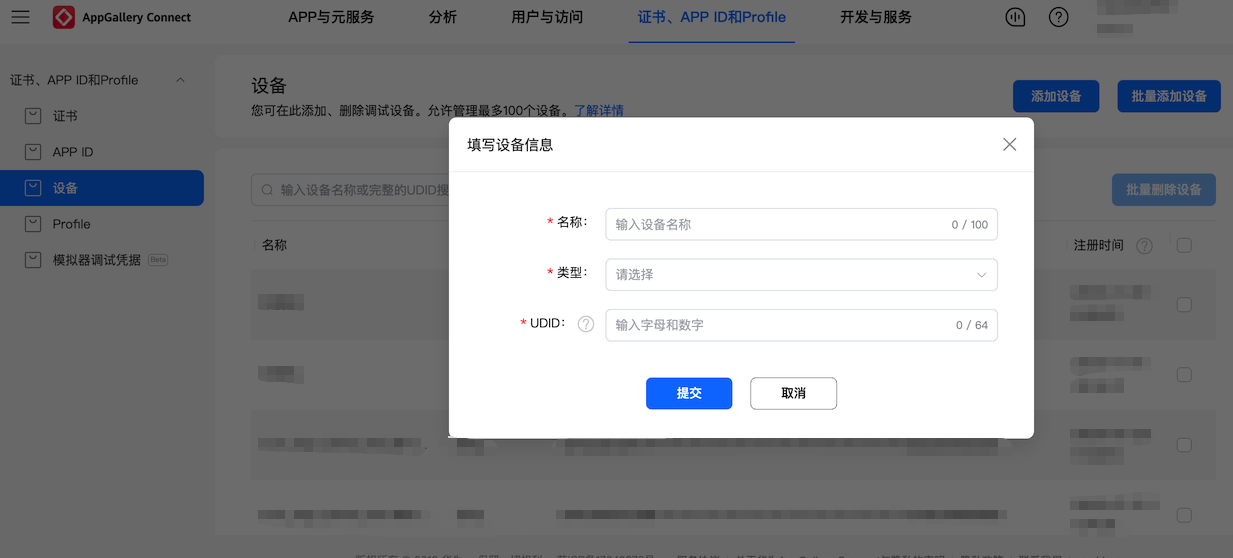 步骤四:进入管理中心-应用服务-AppGallery Connect-证书、APPID和profile-设备-添加设备