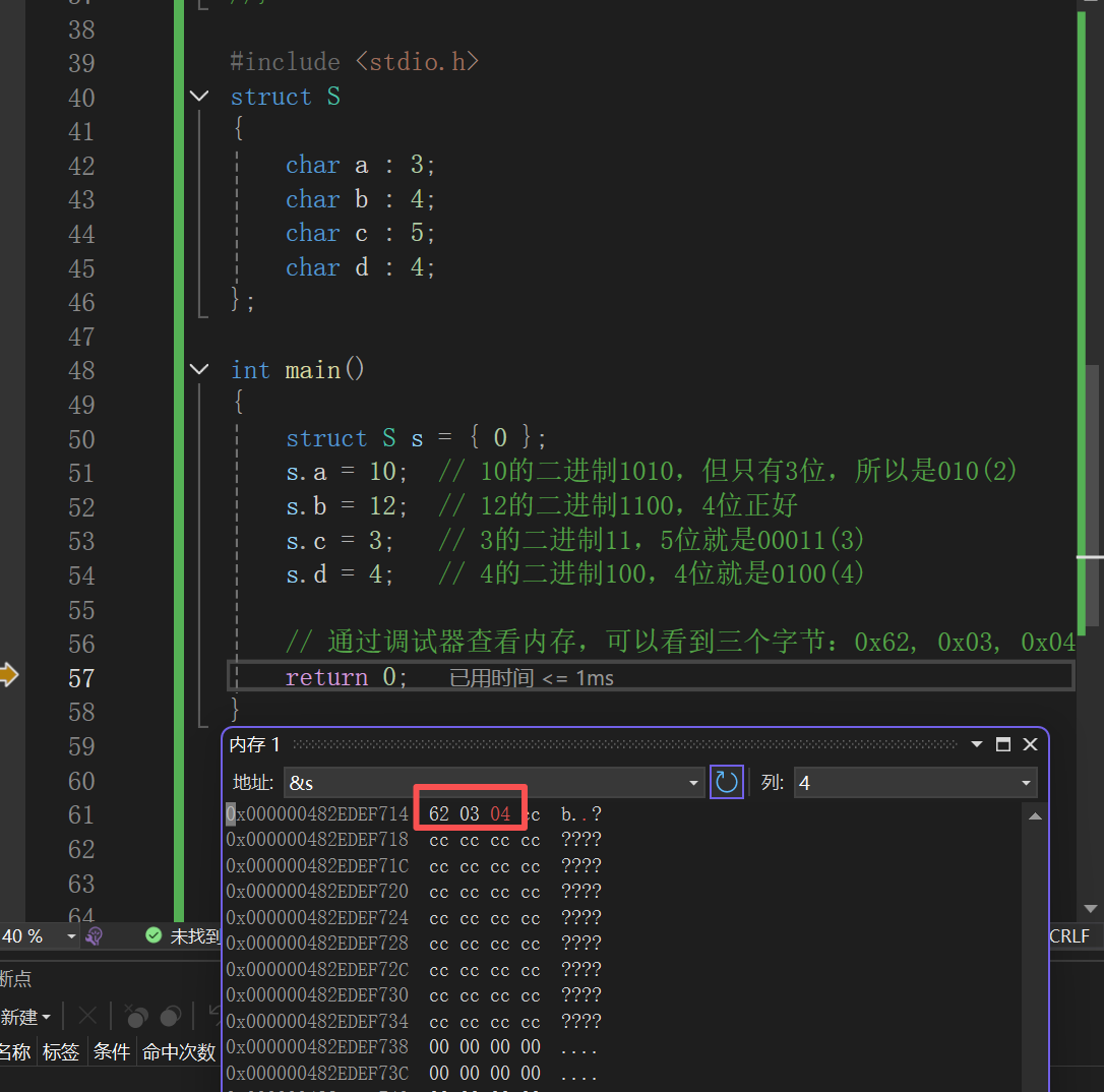 // 通过调试器查看内存,可以看到三个字节:0x62, 0x03, 0x04