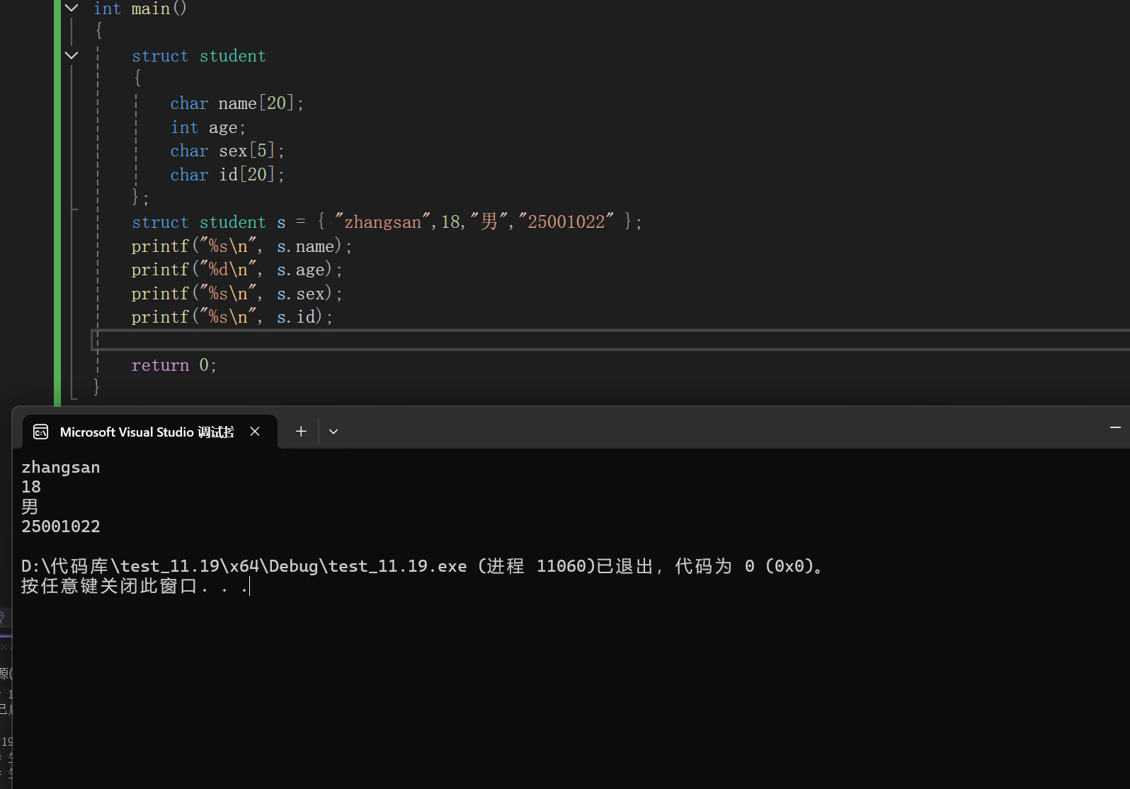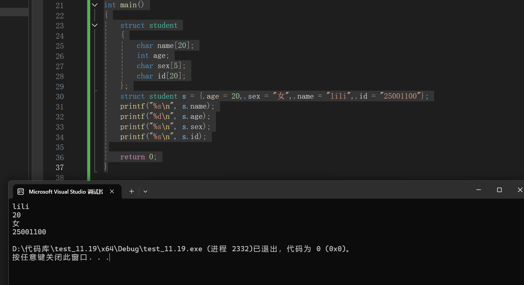 struct student s = {.age = 20,.sex = "女",.name = "lili",.id = "25001100"};