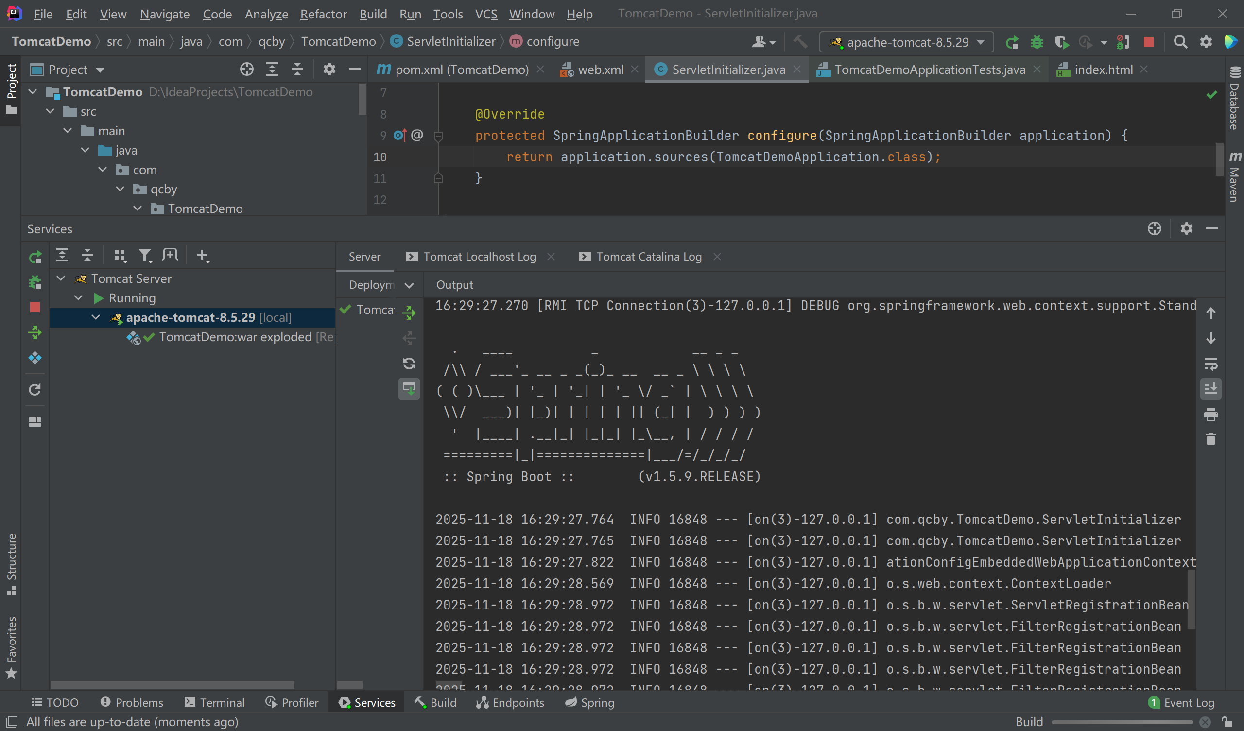 外置Tomcat启动→发现 ServletInitializer (继承自 SpringBootServletInitializer)→调用 configure() 方法→启动 Spring Boot 主类 (Application.class)→Spring Boot 应用正常运行