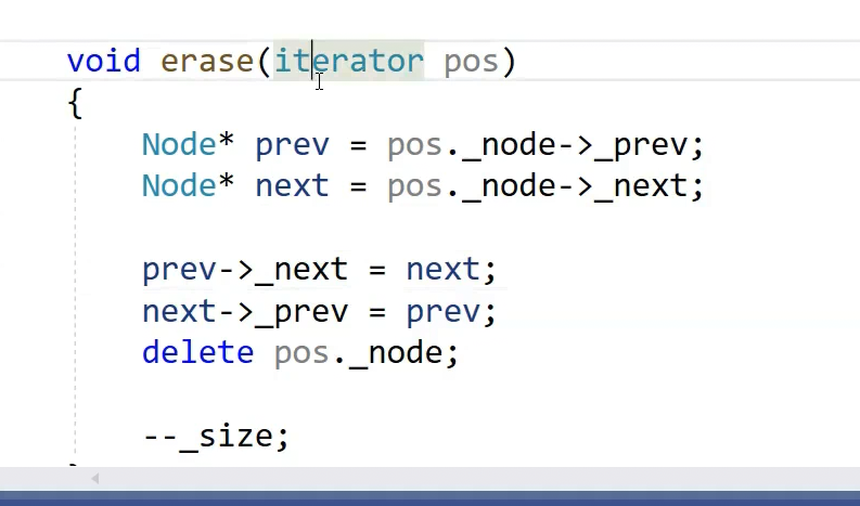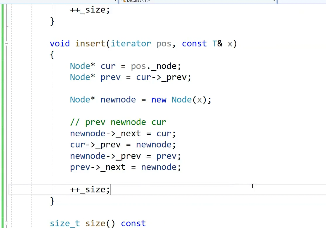 insert 是在pos之前插入,需要获取节点的指针,解释了为什么struct搞成全共有,链表要不断访问prev next这些,为什么迭代器也全共有,成员变量这些都紧密联系。pos之前插入,里面有这个位置的指针,我得拿到这个位置指针,前一位置指针,该指针指向就行