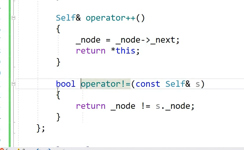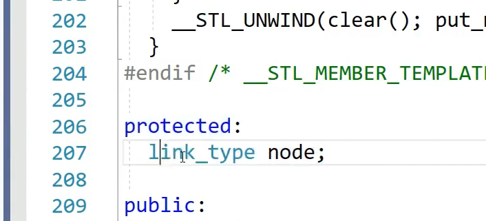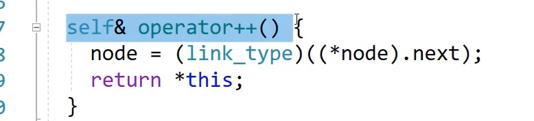 有这样一个类,核心成员是link_type就是node*,这个类封装了一个node节点指针,解引用就是节点,++就是到下一个位置,找不到下一个位置,节点并不是连续的